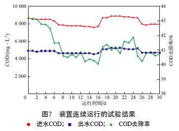 ÔÚÉÏÊöʵÑéÈ·¶¨µÄ×îÓŹ¤ÒÕÌõ¼þÏ£¬½øÐÐ30dµÄ×°ÖÃÁ¬ÐøÔËÐÐÊÔÑ飬ÒÔ¼ìÑéϵͳµÄÔËÐÐÎȶ¨ÐÔ¡£×°ÖÃÁ¬ÐøÔËÐеÄÊÔÑé½á¹û¼ûͼ7¡£ÓÉͼ7¿É¼û£¬ËäÈ»½øË®Ë®ÖÊÓÐËù±ä»¯£¬µ«×ª¹ÄÌú̼΢µç½âÉ豸¶Ô·ÏË®CODµÄÈ¥³ýÂÊÔÚ30 dÄÚ»ù±¾Îȶ¨£¬±£³ÖÔÚ40.1%¡«43.2%Ö®¼ä£¬²¢³Ê»ºÂýϽµÇ÷ÊÆ¡£