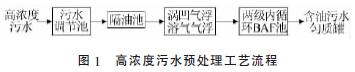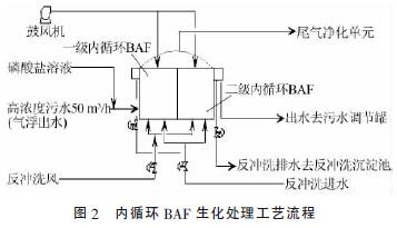 由于高浓度污水的污染物浓度高、水质波动大,常规生物处理方式无法承受。采用强化生化处理技术——内循环 BAF 技术进行高浓度污水的生化处理,通过利用内循环BAF 技术的大流量内循环流的水力学特征,首先对进入装置的高浓度原水进行大比例的稀释,从而使整个反应器的生化环境得以稳定,再利用内循环BAF 技术的传质速度快、微生物种类多、活性高的特性,将高浓度污水中的污染物快速降解,从而达到预处理的目的。高浓度污水内循环BAF 生化处理单元流程如图2 所示。