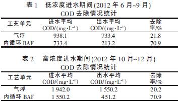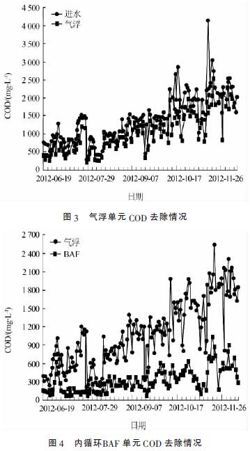 高浓度污水预处理系统气浮单元和内循环BAF 单元的COD去除情况分别如图3、图4 所示。