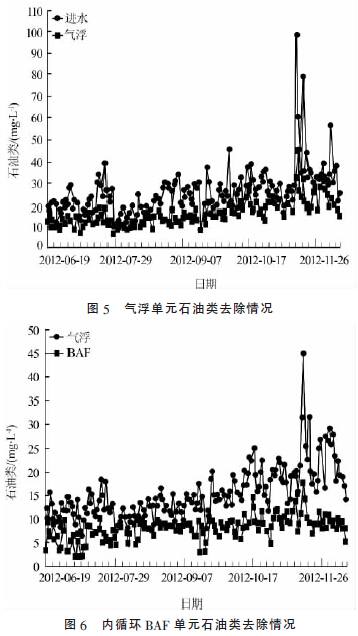 预处理系统气浮单元和内循环BAF 单元石油类去除情况分别如图5、图6 所示。去除情况统计如表3 所示。