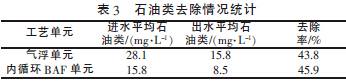 由表3 可见,气浮、内循环BAF 工艺单元对石油类具有良好的去除效果。运行期间,两级气浮单元对石油类的去除率为43.8%,内循环BAF 单元对石油类的去除率为45.9% ,总COD去除率达到了69.6%。经过预处理后,水中石油类质量浓度平均值由进水的28.1mg/L 降低至8.5mg/L,满足了预处理的设计要求。