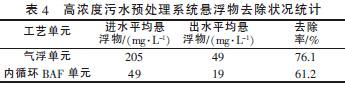 高浓度污水预处理系统在运行期间SS 去除状况统计结果如表4 所示。