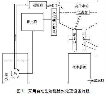 中国水利水电科学研究院在大量试验研究的基础上,对传统慢滤技术进行优化改进,研发了一种小型家用自动生物慢滤水处理设备,主要由高位配水箱、前置Y 型过滤器、生物慢滤滤装置和自动化控制配电箱组成,工艺流程如图1 所示。