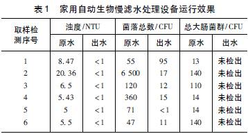 家用自动生物慢滤水处理设备在甘肃省会宁县会师镇和新添堡乡进行了技术示范,并于2011 年7 月至9 进行了6 次取样检验。超标污染物主要包括浊度、菌落总数和总大肠菌群,其进出水水质情况如表1 所列,其中,菌落总数为每mL 的量,总大肠菌群为每100 mL 的量。由表1 可知,家用自动生物慢滤水处理设备对浊度的去除效果明显,原水浊度为5 ~20. 36 NTU,出水浊度均低于1 NTU; 对菌落总数的去除效果显著,出水均低于500 CFU/mL; 出水水质均满足《生活饮用水卫生标准》(GB 5749—2006) 的要求。