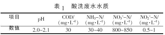 不锈钢生产过程中需用90~160 g/L 硝酸和50~60 g/L 氢氟酸的混酸进行酸洗。具有强氧化性的硝酸可以将金属和金属氧化物氧化, 生成Cr3+、Fe3+和Ni2+ 〔1〕。从酸洗液中取出的金属材料,表面上仍附着少量的酸洗液,必须用水冲洗,由此排出的冲洗水即为酸洗废水。酸洗废水中含有大量的硝酸盐,常规工艺的污水处理厂并不能对硝酸盐进行有效处理,导致出水中总氮含量过高。若能在酸洗废水进入污水 处理厂之前即对其进行一定程度的处理,将会减少后续污水处理厂的压力,使水厂出水水质达标。