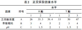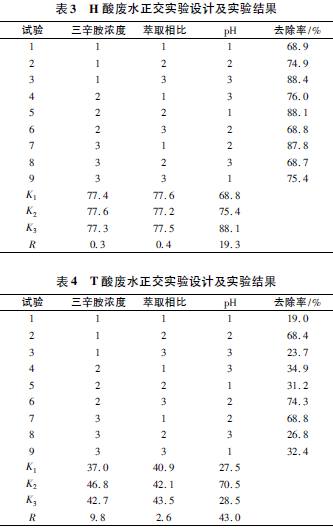 影响H 酸、T 酸废水络合萃取效果主要是三辛胺浓度、萃取相比和pH 值。温度和萃取时间相对影响较小,正交实验不考虑它们。采用三因素三水平的正交表,在室温以及充分接触时间下,按表2 进行正交实验。