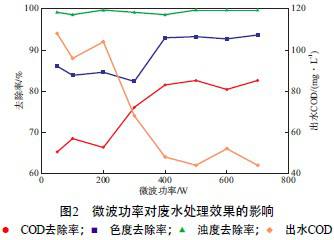µ±PAC¼ÓÈëÁ¿Îª200 mg/L¡¢PAM¼ÓÈëÁ¿Îª3mg/L¡¢·ÏË®pH=3¡¢FeSO4¼ÓÈëÁ¿Îª250 mg/L¡¢H2O2¼ÓÈëÁ¿Îª1 200 mg/L¡¢Î¢²¨·øÉäʱ¼äΪ40 minʱ£¬Î¢²¨¹¦ÂʶԷÏË®´¦ÀíЧ¹ûµÄÓ°Ïì¼ûͼ2¡£ÓÉͼ2¿É¼û£º×ǶÈÈ¥³ýÂÊһֱά³ÖÔÚ95%ÒÔÉÏ£»µ±Î¢²¨¹¦ÂÊÔÚ300¡«400 Wʱ£¬É«¶ÈÈ¥³ýÂÊÏÔÖøÌá¸ß£»µ±Î¢²¨¹¦ÂÊÔÚ200¡«500 Wʱ£¬CODÈ¥³ýÂÊÃ÷ÏÔÔö´ó¡£Î¢²¨·¢ÉúÆ÷²ÉÓÃζȷ´À¡·¨µ÷½Ú΢²¨Êä³ö¹¦ÂÊ£¬µ±Î¢²¨¹¦ÂʵÍÓÚ300 Wʱ£¬·ÏË®µÄζÈδÉÏÉý£»µ±Î¢²¨¹¦Âʳ¬¹ý400 Wʱ£¬·ÏË®µÄζÈѸËÙÉýε½É趨ֵ50 ¡æ£¬ÓÐÀûÓÚFenton·´Ó¦Éú³É×ÔÓÉ»ù¡¤OH¡£µ±Î¢²¨¹¦ÂÊΪ500 Wʱ£¬³öË®COD×îµÍ£¬Îª64 mg/L¡£Òò´Ë£¬Ñ¡ÓÃ΢²¨¹¦ÂÊΪ500 W¡£