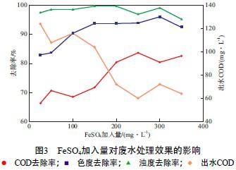 µ±PAC¼ÓÈëÁ¿Îª200 mg/L¡¢PAM¼ÓÈëÁ¿Îª3mg/L¡¢·ÏË®pH=3¡¢ H2O2¼ÓÈëÁ¿Îª1 200 mg/L¡¢Î¢²¨¹¦ÂÊΪ400 W¡¢Î¢²¨·øÉäʱ¼äΪ40 minʱ£¬ FeSO4¼ÓÈëÁ¿¶Ô·ÏË®´¦ÀíЧ¹ûµÄÓ°Ïì¼ûͼ3¡£ÓÉͼ3¿É¼û£º×ǶÈÈ¥³ýÂÊʼÖÕά³ÖÔÚ90%ÒÔÉÏ£»FeSO4¼ÓÈëÁ¿Îª0¡«300 mg/Lʱ£¬É«¶ÈÈ¥³ýÂÊÃ÷ÏÔÔö´ó£»µ±FeSO4¼ÓÈëÁ¿ÔÚ100¡«250 mg/Lʱ£¬CODÈ¥³ýÂÊÔö´ó£¬µ«Ëæºó½µµÍ£¬ÕâÊÇÒòΪFeSO4Ũ¶È¹ý¸ßʱ£¬Fenton·´Ó¦ËÙÂʹý´ó£¬²¿·Ö¡¤OHÓëFe2+·´Ó¦Éú³ÉOH-£¬Fe3+ÓëH2O2·´Ó¦Éú³ÉÑõ»¯ÐԽϵ͵ġ¤OH2£»µ±FeSO4¼ÓÈëÁ¿Îª250 mg/Lʱ£¬CODÈ¥³ýÂÊ×î¸ß£¬Îª83.70%£¬³öË®CODΪ60.00 mg/L¡£Òò´Ë£¬È·¶¨×î¼ÑFeSO4¼ÓÈëÁ¿Îª250 mg/L¡£