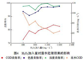 µ±PAC¼ÓÈëÁ¿Îª200 mg/L¡¢PAM¼ÓÈëÁ¿Îª3mg/L¡¢·ÏË®pH=3¡¢FeSO4¼ÓÈëÁ¿Îª250 mg/L¡¢Î¢²¨¹¦ÂÊΪ400 W¡¢Î¢²¨·øÉäʱ¼äΪ40 minʱ£¬H2O2¼ÓÈëÁ¿¶Ô·ÏË®´¦ÀíЧ¹ûµÄÓ°Ïì¼ûͼ4¡£ÓÉͼ4¿É¼û£ºÉ«¶ÈºÍ×ǶÈÈ¥³ýÂÊһֱά³ÖÔÚ90%ÒÔÉÏ£»H2O2¼ÓÈëÁ¿Îª1 400 mg/Lʱ£¬CODÈ¥³ýÂÊ×î¸ß£¬Îª83.70%£¬³öË®CODΪ60.00 mg/L¡£Òò´Ë£¬È·¶¨H2O2¼ÓÈëÁ¿Îª1 400 mg/L¡£