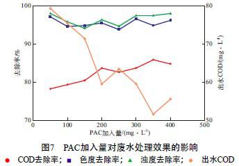 µ±PAM¼ÓÈëÁ¿Îª3 mg/L¡¢·ÏË®pH=3¡¢FeSO4¼ÓÈëÁ¿Îª250 mg/L¡¢H2O2¼ÓÈëÁ¿Îª1 200 mg/L¡¢Î¢²¨¹¦ÂÊΪ400 W¡¢Î¢²¨·øÉäʱ¼äΪ40 minʱ£¬PAC¼ÓÈëÁ¿¶Ô·ÏË®´¦ÀíЧ¹ûµÄÓ°Ïì¼ûͼ7¡£