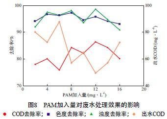 µ±PAC¼ÓÈëÁ¿Îª200 mg/L¡¢·ÏË®pH=3¡¢FeSO4¼ÓÈëÁ¿Îª250 mg/L¡¢H2O2¼ÓÈëÁ¿Îª1 200 mg/L¡¢Î¢²¨¹¦ÂÊΪ400 W¡¢Î¢²¨·øÉäʱ¼äΪ40 minʱ£¬PAM¼ÓÈëÁ¿¶Ô·ÏË®´¦ÀíЧ¹ûµÄÓ°Ïì¼ûͼ8¡£ÓÉͼ8¿É¼û£º×ǶȺÍÉ«¶ÈÈ¥³ýÂÊά³ÖÔÚ90%ÒÔÉÏ£»µ±PAMµÄ¼ÓÈëÁ¿Îª12 mg/Lʱ£¬CODÈ¥³ýÂÊ×î¸ß£¬Îª86.41%£¬³öË®CODΪ49.62 mg/L¡£PAM¼ÓÈëÁ¿¹ý¸ßʱ£¬·ÏË®ÖÐÊ£ÓàµÄPAMµ¥ÌåºÍË®½â»ùÍÅÏûºÄ²¿·Ö¡¤OH¡£¾ÊµÑéÈ·¶¨PAMµÄ¼ÓÈëÁ¿Îª12 mg/L¡£