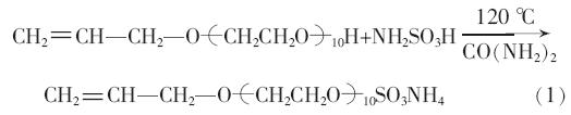 ¡¡¡¡½«500 g (1.0 mol) APEO ºÍ96 g (1.0 mol)°±»ù»ÇËáÒÔ¼°3.75 g ÄòËØ×°ÈëÈý¿ÚÉÕÆ¿ÖÐ,ÊÒνÁ°è1.0 h ºóÉýÎÂÖÁ120 ¡æ,¼ÌÐø½Á°è·´Ó¦5.0 h。·´Ó¦½áÊøÊ±ÉϲãÈÜÒºÇåÁÁ΢ºì,ϲãÂÔÓйÌÌå。½«²úÎïÓôóÁ¿ÎÞË®ÒÒ´¼ÈܽⲢ¹ýÂË,³ýȥδ·´Ó¦µÄ°±»ù»ÇËá。¼õѹÕôÁó³ýÈ¥ÒÒ´¼ÈܼÁ, ²¢½«º¬Î¢Á¿ÒÒ´¼µÄÏ©±û»ù¾ÛÃÑ»ÇËáï§ÖÃÓÚÕæ¿ÕºæÏäÖÐÓÚ60 ¡æ¸ÉÔï,µÃµºìÉ«ð¤³í״͸Ã÷ÒºÌåAPES。·´Ó¦·½³Ìʽ¼ûʽ(1)。