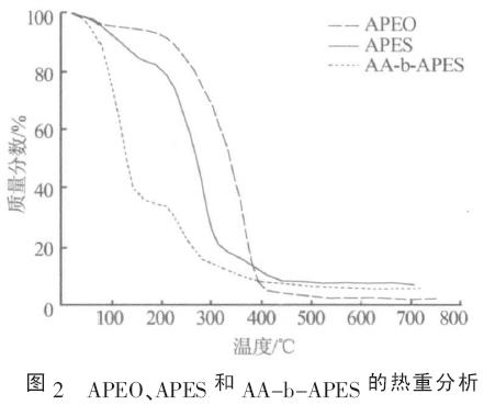 ¡¡¡¡¸÷È¡10 mg APEO、APES ÓëAA-b-APES ÑùÆ·,ÔÚÈÈÖØ·ÖÎöÒÇ(Perkin-Elmer Derivatograph, µÂ¹úLinseis ¹«Ë¾)ÖнøÐвâÊÔ,·ÖÎöÆäÈÈ·Ö½â×´¿ö。ʵÑéÔÚµªÆø»·¾³ÖнøÐÐ,ÆøÁ÷Á¿Îª4 L/min,ÉýÎÂËÙ¶ÈΪ20 ¡æ/min,ζȷ¶Î§Îª25¡«700 ¡æ。