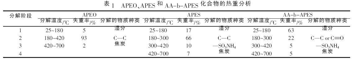 ¡¡¡¡Óɱí1 ¿ÉÖª, ´Ó25¡«180 ¡æÎªË®·Ö»òʪ·ÖµÄ»Ó·¢,180 ¡«300 ¡æÎªC¡ªC ¼üµÄ¶ÏÁÑ,300 ¡«420 ¡æÎª¡ªSO3NH4ÈȽµ½â½×¶Î,Ôڴ˽׶ÎÑùÆ·ÖÊÁ¿ËðʧÂÊ´ï5%¡«10%,ÕâÓëÔªËØ·ÖÎöµÄ½á¹û´óÖÂÏ൱。420¡«700 ¡æÎªÈȽµ½âµÄ×îºó½×¶Î, ÔÚÕâÒ»½×¶ÎÓлú·Ö×ÓÖ÷Á´·¢Éú¶ÏÁÑÉú³ÉµÄС·Ö×ÓÁ´½øÒ»²½½¹»¯。ÈÈÖØ·ÖÎö½á¹û±íÃ÷, ºÏ³ÉµÄµ¥ÌåAPES ÒÔ¼°¾ÛºÏÎïAA-b-APES ¶¼Ö»ÔڽϸߵÄζÈϲŷֽâ, ÓнÏÁ¼ºÃµÄÈÈÎȶ¨ÐÔ。