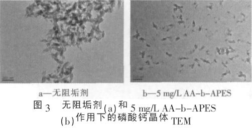 ¡¡¡¡´Óͼ3 ¿ÉÒÔ¿´³ö: ×蹸¼ÁAA-b-APES µÄ¼ÓÈëʹµÃÁ×Ëá¸Æ¾§Ìå¿ÅÁ£³ß´ç´ÓÔÀ´µÄÔ¼200 nm ±äΪ25¡«100 nm µÄϸС¿ÅÁ£,Õâ±íÃ÷×蹸¼ÁAA-b-APESµÄ´æÔÚÃ÷ÏԵظıäÁËÁ×Ëá¸Æ¾§Ìå³ß´ç,´Ó¶øÊ¹Á×Ëá¸Æ¿ÅÁ£·ÖÉ¢ÔÚÒºÌåÖÐ×èÖ¹ÁËÁ×Ëá¸ÆµÄ³Á»ý。¡£
