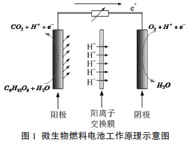 ͼ1 ÊÇ΢ÉúÎïȼÁÏµç³Ø¹¤×÷ÔÀí¼òÒ×ʾÒâͼ¡£ÔÚ΢ÉúÎïȼÁÏµç³ØÖУ¬¿É½µ½âÓлúÖÊÔÚϸ°ûÄÚ±»Î¢ÉúÎï´úл·Ö½â£¬´Ë¹ý³ÌÖвúÉúµÄµç×Óͨ¹ýºôÎüÁ´´«Ê䵽ϸ°ûĤÉÏ£¬È»ºóµç×Ó½øÒ»²½´Óϸ°ûÄ¤×ªÒÆµ½µç³ØµÄÑô¼«ÉÏ¡£Ñô¼«Éϵĵç×Ó¾ÓÉÍâµç·µ½´ïµç³ØµÄÒõ¼«£¬×îÖÕ£¬µç×ÓÓëµç×ÓÊÜÌ壨Ñõ»¯¼Á£©ÔÚÒõ¼«±íÃæÉÏÏà½áºÏ¡£¶øÓлúÖÊ´úл·Ö½â¹ý³ÌÖвúÉúµÄÖÊ×ÓÔòÔÚµç³ØÄÚ²¿Í¨¹ýÑôÀë×Ó½»»»Ä¤´ÓÑô¼«ÇøÀ©É¢µ½Òõ¼«Çø¡£µç×ÓºÍÖÊ×ÓµÄÒÆ¶¯Íê³ÉÁËÕû¸ö΢ÉúÎïȼÁÏµç³ØµÄµç×Ó´«µÝ¹ý³Ì¡£