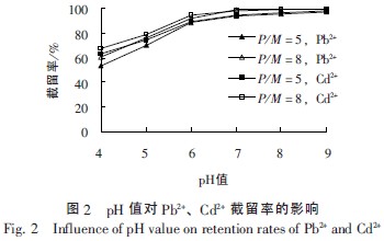 pH ÖµÔÚÖØ½ðÊôÂçºÏ·´Ó¦ÖÐÆðÖØÒª×÷Óã¬Ñ¡ÔñÊÊÒ˵ÄpH ÖµÊDZ£Ö¤ñîºÏ¹¤ÒÕÓÐÁ¼ºÃ´¦ÀíЧ¹ûµÄǰÌá¡£ÔڿǾÛÌÇͶ¼ÓÁ¿Ò»¶¨µÄÌõ¼þÏ£¬¿¼²ìpH Öµ¶ÔPb2+¡¢Cd2+½ØÁôÂʵÄÓ°Ï죬½á¹ûÈçͼ2 Ëùʾ¡£