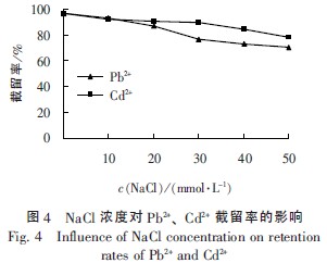 ÔÚpH ֵΪ7£®0£¬P/M ֵΪ6 µÄÌõ¼þÏ£¬¿¼²ì²»Í¬Å¨¶ÈµÄNaCl ÈÜÒº¶Ô½ðÊôÀë×Ó½ØÁôÂʵÄÓ°Ï죬½á¹ûÈçͼ4 Ëùʾ¡£
