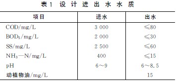 该屠宰加工厂一年屠宰生猪50万头左右,平均每天1 270头,生猪屠宰排水量为0.5m3/头,平均每天产生废水量为635m3,根据季节变化和公司发展需要,设计进水量为1 000m3/d,设计进出水水质如表1所示。