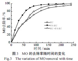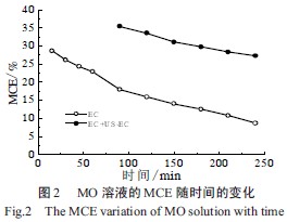 µçÁ÷ЧÂÊÊǺâÁ¿µç»¯Ñ§Ñõ»¯¼¼ÊõµÄÒ»¸öÖØÒªÖ¸±ê¡£MO ÈÜÒºµÄMCE ÔÚEC ºÍEC+US-EC ¹ý³ÌÖÐËæÊ±¼äµÄ±ä»¯Èçͼ2 Ëùʾ¡£ÓÉͼ2 ¿ÉÖª£¬MO ÈÜÒºµÄMCE Ëæ×Å·´Ó¦Ê±¼äµÄÑÓ³¤£¬ÔÚEC ¹ý³ÌÖÐÊÇÖð½¥½µµÍµÄ¡£MCE ÓÉ15 min ʱµÄ28.68%½µµÍµ½240 minµÄ8.68%£»ÒòÎªËæ×ŵç½âʱ¼äµÄÑÓ³¤£¬ÈÜÒºÖеÄMOÔÚÖ𽥵ؼõÉÙ£¬ÎöÑõºÍÎöÇ⸱·´Ó¦µÄ¼Ó¾ç£¬µ¼ÖÂMCE Öð½¥½µµÍ¡£¶øÇÒÐí¶àÎÄÏ×Ò²ÌÖÂÛÁË´ËÏÖÏó[10-11]³¬Éù¿É¼Ó¿ìMO ¼°ÆäTOC µÄÈ¥³ý£¬±ØÊ¹µçÁ÷µÄÀûÓÃЧÂÊÔö¼Ó¡£µ«Êdz¬ÉùÔÚ¿ÉÒÔ¼Ó¿ìMO ÔÚBDD µç¼«ÉÏÑõ»¯µÄͬʱ£¬±ØÈ»ÏûºÄÄÜÁ¿¡£Îª½ÚÔ¼ÄܺĶø²»½µµÍMO µÄÑõ»¯Ð§¹û£¬Ìá³öÔÚ·´Ó¦³õÆÚ£¨Ç°60 min£©µçÁ÷ЧÂʱȽϸßʱ£¬Ö»²ÉÓõ绯ѧÑõ»¯£»ÔÚ·´Ó¦ºóÆÚ£¨60 min ºó£©µçÁ÷ЧÂʱȽϵÍʱ²ÉÓó¬ÉùÐͬµç»¯Ñ§Ñõ»¯½µ½âMO£¬¼´EC+US-EC£¬ÕâÑù½ÏµÍµÄÄܺĻñµÃ½ÏºÃµÄ½µ½âЧ¹û¡£