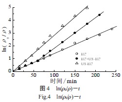 ÔÚUS-EC ºÍEC 2 ÖÖ¹ý³ÌÖÐÒÔln ( ¦Ñ0/¦Ñ)£t ×÷ͼ£¬½á¹ûÈçͼ4 Ëùʾ¡£ÓÉͼ4 ¿ÉÖª£¬ln( ¦Ñ0/¦Ñ)£t ¾ù³ÊÏßÐÔ¹ØÏµ£¬¼´MO µÄ½µ½â·´Ó¦ÔÚ2 ÖÖ¹ý³ÌÖж¼×ñÊØ×¼Ò»¼¶·´Ó¦¶¯Á¦Ñ§·½³Ì¡£Í¨¹ý¼ÆËãµÃµ½MO ÔÚUS-ECºÍEC ¹ý³ÌµÄËÙÂʳ£Êý£¨k£©·Ö±ðΪ4.76¡Á10-4 s-1 ºÍ2.32¡Á10-4 s-1£¬¼ÓÈ볬Éùºó¿ÉÒÔʹ·´Ó¦ËÙÂÊÔö¼Ó1.04±¶£¬Õâ˵Ã÷MO ÔÚUS-EC ¹ý³ÌÖÐÄܹ»¸ü¿ìµØ±»Ñõ»¯È¥³ý¡£Òò´Ë³¬Éù´Ù½øÁËMO ÔÚBDD µç¼«Éϵĵ绯ѧÑõ»¯¡£¶ø¶ÔÓÚÁ½¶Îʽ¹¤ÒÕ³õʼÎÛȾÎïÔÚ4 h ÒѾ»ù±¾½µ½âÍêÈ«£¬¶øÔÚÕâ4 h ÄÚ£¬ËäÈ»¼×»ù³ÈÈÜÒºµÄ½µ½âËÙÂÊ·ûºÏÒ»¼¶¶¯Á¦Ñ§¹æÂÉ£¬µ«ÊÇÃ÷ÏÔµÄÒÔ1 h Ϊ·Ö½çµã·ÖΪ2 ¸ö½×¶Î¡£ÔÚǰ1 h µÄµç»¯Ñ§Ñõ»¯½×¶Î£¬ºÍµ¥¶ÀµÄµç»¯Ñ§Ñõ»¯Çé¿öÏàͬ£¬ks=2.32¡Á10-4 s-1¡£1 hºó£¬³¬ÉùµÄ¼ÓÈë¼ÓËÙµç´ß»¯Ñõ»¯·´Ó¦£¬³¬ÉùÐͬµç»¯Ñ§Ñõ»¯¸ü¼ÓÓÐÀûÓÚ³õʼÎÛȾÎïµÄ¿ìËÙ½µ½â£¬´Ëʱ½µ½â·´Ó¦µÄËÙÂʳ£ÊýÌá¸ßµ½3.93¡Á10-4s-1£¬Êǵ¥¶Àµç»¯Ñ§Ñõ»¯Ê±µÄ1.69 ±¶£¬ÕâÒ²¾Í±£Ö¤ÁËÔÚÁ½¶Îʽ¹¤ÒÕÖм׻ù³È¸ßЧ¿ìËٵĽµ½â¡£¡£