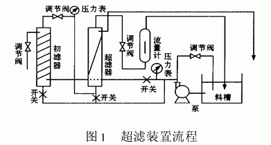 北京源泉环境科技有限公司提供的外压式中性聚砜材质中空纤维管式超滤器。超滤器的主要技术指标:pH2~13,温度范围5~45℃,纤维内径0.38mm,每根纤维有效膜面积1.13平方厘米,中空纤维长1m,每根柱内中空纤维数量1.65万根,工作压力0~2.0MPa。试验装置流程见图1。