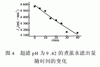 超滤pH为9.42的煮茧水,其滤出量随时间的变化见图4。