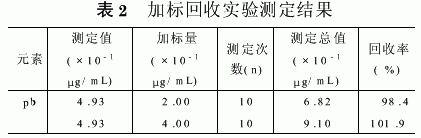 加标回收实验是按实验方法取样品,并加入一定量的铅标准溶液后进行处理和测定,结果见表2。