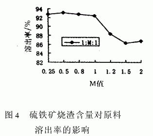 我们采用固定其中两组分,变动其中一组分来观察产物溶出率的变化。图3表明,随着纯碱比例N升高产物溶出率上升,当N大于1时,其上升趋势不再明显。实验发现,在N为1.2和1.5时,产物酸浸都会产生气泡,说明此时纯碱已过量。从图4可以看出,产物溶出率随硫铁矿渣含量升高而降低。我们选定原料合理配比为粉煤灰∶硫铁矿烧渣∶纯碱=1∶1∶0.8。