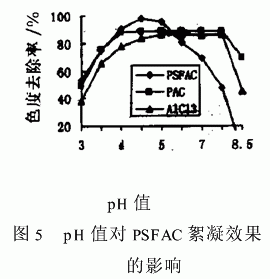 3.2.1 pH值 为考察pH值对PSFAC絮凝剂效果的影响,进行了不同pH值下同剂量的絮凝实验,并以相同条件下PAC和氯化铝为参照。以自配单一染料(分散红FB)废水为原水(水质COD858mg/L),其在波长530nm处的吸光度为5.312,pH7.5。絮凝性能以废水色度去除率表示。