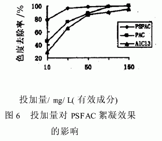 从图5可以看出,在酸性条件下PSFAC比PAC、氯化铝具有较好的脱色性能,但其使用pH范围比PAC和氯化铝要窄,有效pH范围为3.5~7,该模拟废水最佳的絮凝pH值为4.5。