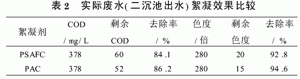 PSAFC与PAC和氯化铝对模拟印染废水絮凝剂性能比较,按絮凝实验步骤操作,加入的各种絮凝剂均为50mg/L,效果见表1。从中可知,其去除COD和脱色明显优于PAC和AlCl3。本产品生成的矾花大而密实,絮体成层沉降,10分钟内能完全沉降,悬浮泥花少,污泥体积小。实际印染废水絮凝效果见表2,本产品与PAC效果相当,但沉降性能比PAC好,可见合成的PSAFC确是一种性能优良的絮凝剂。