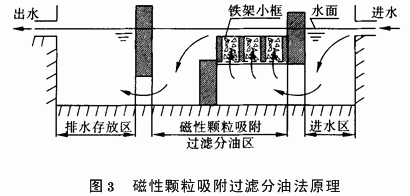 该法利用磁性材料产生的磁力来吸附废水中乳化态油和其他杂质,其原理见图3。