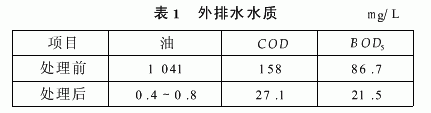 某铁路机车修理厂在洗涤机车过程中产生废水约100m3h。对该废水进行测试时发现,在前10min内上浮效率上升较快,此后上浮效率上升缓慢。考虑该废水含油量高达1200mg/L,故设计了综合分油池:水力停留时间为0.2~1.0h,宽为2m,平均水深为1.5m,总池容为45m3(沉淀隔油池的容积为15m3)。废水处理流程为:沉砂过滤槽及沉淀分油池→隔板分油池→蜂窝斜管分油池→磁性颗粒吸附过滤分油池→清水池。在分油池中设置了集油管,以便及时将浮于水面上的油层导入集油池。另外,还设置了水位高度自动调节板,采用全宽度排水(池内水面的高度变动很小),以保持水位线与集油管缺口间的高差始终在10~20mm范围内。之所以将沉砂过滤槽设置在最前面,是由于废水中含有污泥和有机杂质。采取这些综合措施后,该厂外排水水质不达标问题得到了彻底根治。多年来该设施运行平稳,排水口水质清澈透明,含油量仅为0.4~0.8mg/L,达到了GB8978—1996的一级标准(见表1)。