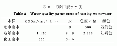 1)废水水质。废水取自造纸厂、毛巾厂、化工厂,废水基本水质情况见表2。