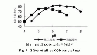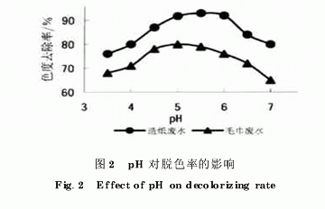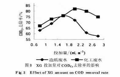 由图可知,XG处理毛巾厂、造纸厂、化工厂废水时,最佳pH值分别为5.0和5.5、6.5;CODCr去除率达到75%;脱色率达80%以上,絮凝效果较好。