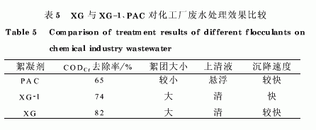 为考察XG的絮凝效果,将XG与XG-1、PAC(最佳pH=5.5~6.5)在相同投加量下分别对废水进行处理,以比较其处理效果,结果见表3、4、5。
