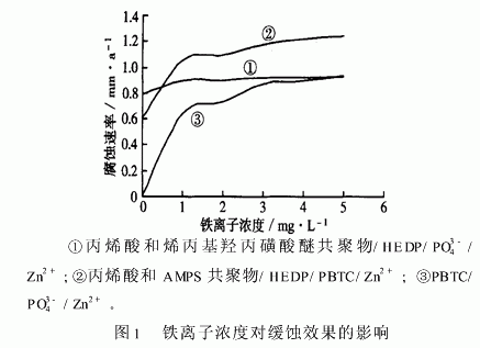 铁离子对不同类型水处理剂的缓蚀效果的影响见图1。