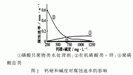 钙硬和碱度对非阳极型药剂缓蚀效果的影响结果见图2。