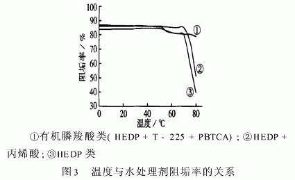 水温在50℃以上时,水垢附着速度开始加大,水温在60℃以上时,水垢显著增多,同时水温对水处理剂的阻垢效率影响较大,钙离子浓度为250mg/L,碳酸氢根离子浓度250mg/L,pH值=8.0,我们选用三种水处理剂进行实验,实验结果见图3。