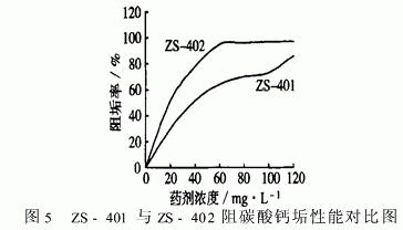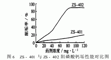 ZS-401与ZS-402阻碳酸钙垢、阻磷酸钙垢性能对比见图5、图6。