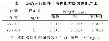 3 配方改进措施及效果 我们现在所用水源中钙硬较高,当循环水浓缩倍数在2.5~3.0倍以上时,水中钙硬+碱度往往超过1100mg/L,这就要求水处理剂具有较高的钙容忍度。ZS-401已经不能满足现有水质需要。
