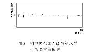 工业纯铁在含有一定量Cl-的水样中可发生孔蚀,加入缓蚀剂可以抑制这种孔蚀的产生。图3给出工业纯铁在0.5MNaCl水溶液与加入0.01MNaNO2的0.5MNaCl水溶液的电流噪声谱〔5〕,图4给出了工业纯铁在1.0×10-3苯甲酸钠溶液中的电压噪声谱〔6〕,从图4中可看出,未加缓蚀剂的噪声图谱上,电流(或电压)有很大移动,而加入缓蚀剂后,电化学噪声电压谱(或电流谱)非常平坦。因此用电化学噪声法可比较准确地分析出缓蚀剂的缓蚀性能。