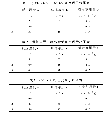 2.1 正交实验本次实验主要研究(NH4)2S2O8—NaHSO3、偶氮二异丁脒盐酸盐、(NH4)2S2O83种引发体系在合成20%阳离子度(阳离子单体占总单体物质的量的百分数)PDA聚合反应中的应用。通过前期反应条件的摸索,选定反应温度、引发剂用量、单体浓度3因素进行正交优化实验。因子水平见表1、表2、表3。