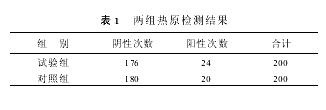 2 结 果 试验组热原检测合格率为88%,对照组为90%,χ2=0.4,P>0.05,差异无显著性。见表1。