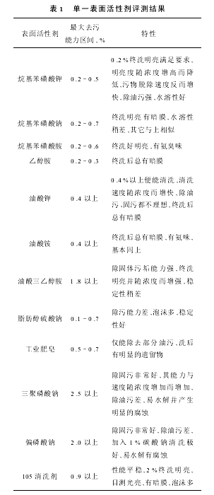 4 清洗剂配方的选择按理论和生产实际需要在选择配方时,应首先考虑以清除固污为主,在此基础上协调选择清除液体污垢的表面活性剂。结合评测单一表面活性剂结果,组成配方有三个方向。