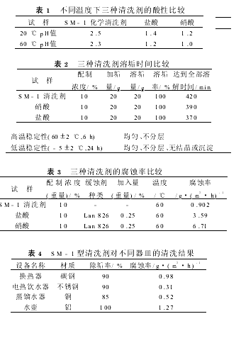 由表1结果可知,SM-1型清洗剂的pH值高于盐酸、硝酸,从一个侧面说明其安全性优于无机强酸。