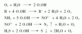 臭氧是不稳定气体,溶于水后生成氧化能力很强的单原子氧轻基(O.OH),它的灭菌能力极强,能破坏分解细胞壁,很快的扩散、渗透进细胞,氧化破坏细胞内的生物酶系统,致死病原体。由于致死的病原体细胞膜破裂,所以细菌无法再生繁殖。同时单原子氧轻基(O.OH)对有机物、无机物的氧化作用也十分强烈。其原理表示如下: