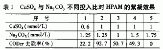 (2)助絮凝剂对HPAM的去除效果。采用200mg/L的HPAM溶液,通过改变CuSO4和Na2CO3,的不同投加量,最终确定Cu2+与Na2CO3最佳投入摩尔比是4:5,结果列于表l。从外观可以初步判断反应结果,静置沉淀后溶液无色透明时助絮凝效果最好,而溶液呈淡蓝色时效果不理想。
