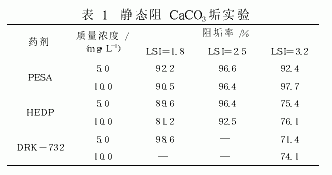 Betz实验室的J.M.Brown等〔19〕进行了PESA对CaCO3的静态阻垢实验,并与羟基亚乙基二膦酸(HEDP)和聚丙烯酸(牌号为GRK-732)进行了比较。实验条件:朗格利尔饱和指数(LSI)分别为1.8、2.5和3.2,Ca2+质量浓度(以CaCO3计)为1102mg/L,CO3为1170mg/L,pH=9.0,温度为70℃。分析结果:药剂量相同时,PESA阻CaCO3垢的性能优于HEDP和丙烯酸,LSI=3.2时尤为明显,如表1所示。